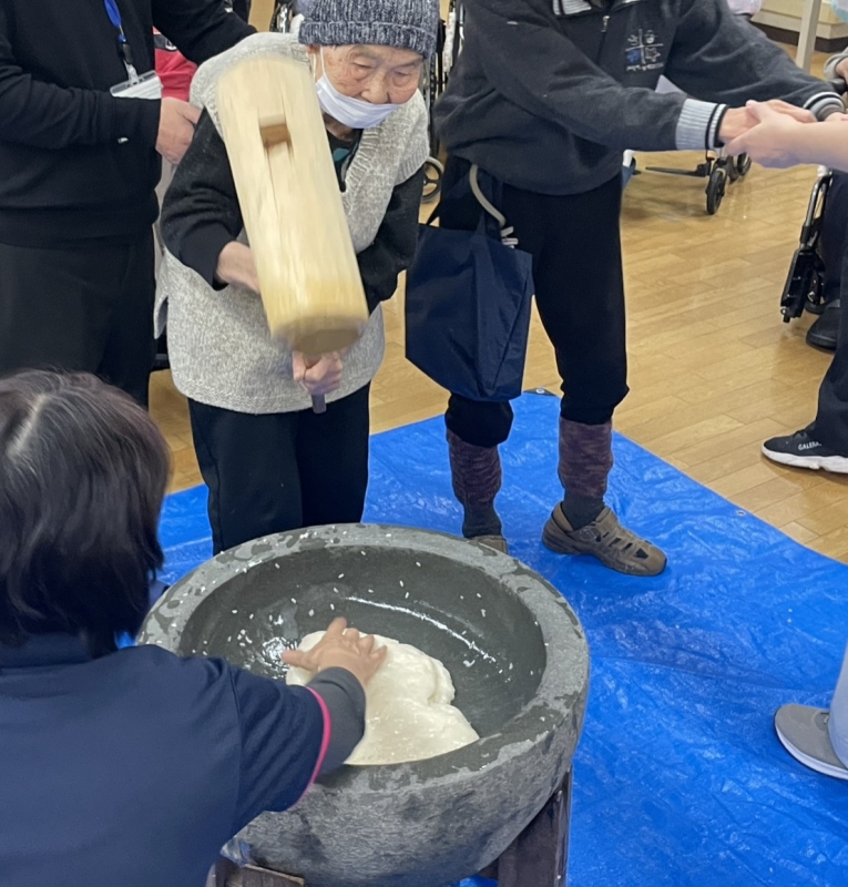 もちつき大会を行いました。「よいしょ」の掛け声に合わせて利用者様も頑張って杵で、ついてくれました。